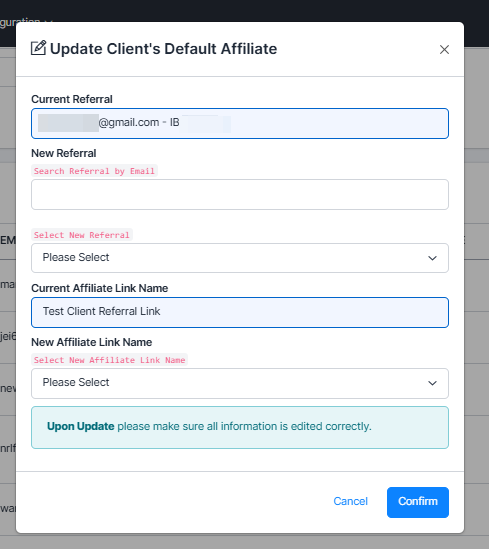 Change the client’s referral Introducing Broker (IB) to the internal IB ID 2195. This step ensures that no further referrals are tracked under the current IB. Kindly refer to the image 5.1.4.3a below for detailed information.