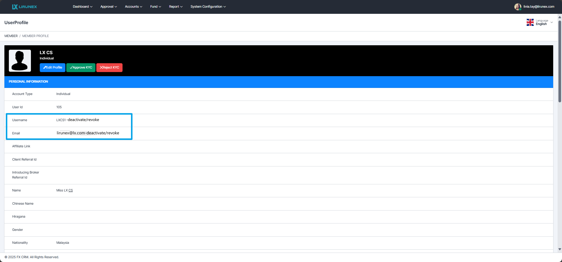 table 5.1.4.1aOld Email lirunex@lx.com New Email (To-Deactivate) lirunex@lx.com-deactivate/revoke Old Username lirunex New Username (To-Deactivate) lirunex-deactivate/revoke - Suspend MT4 Account
