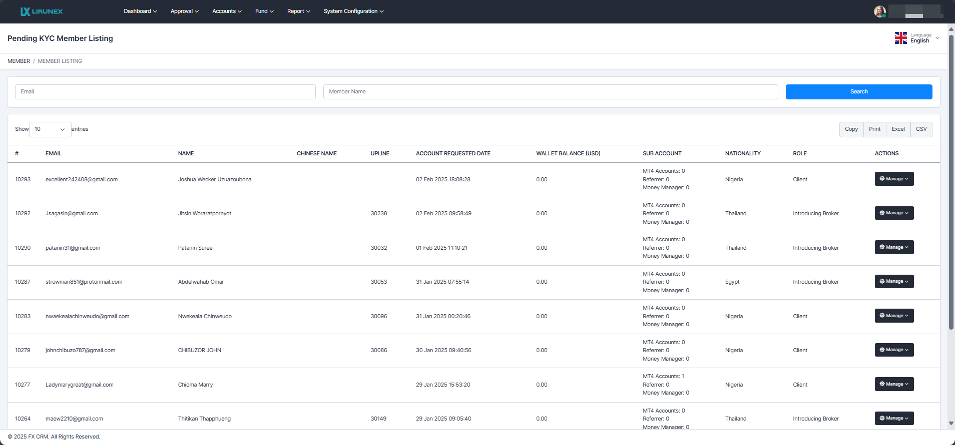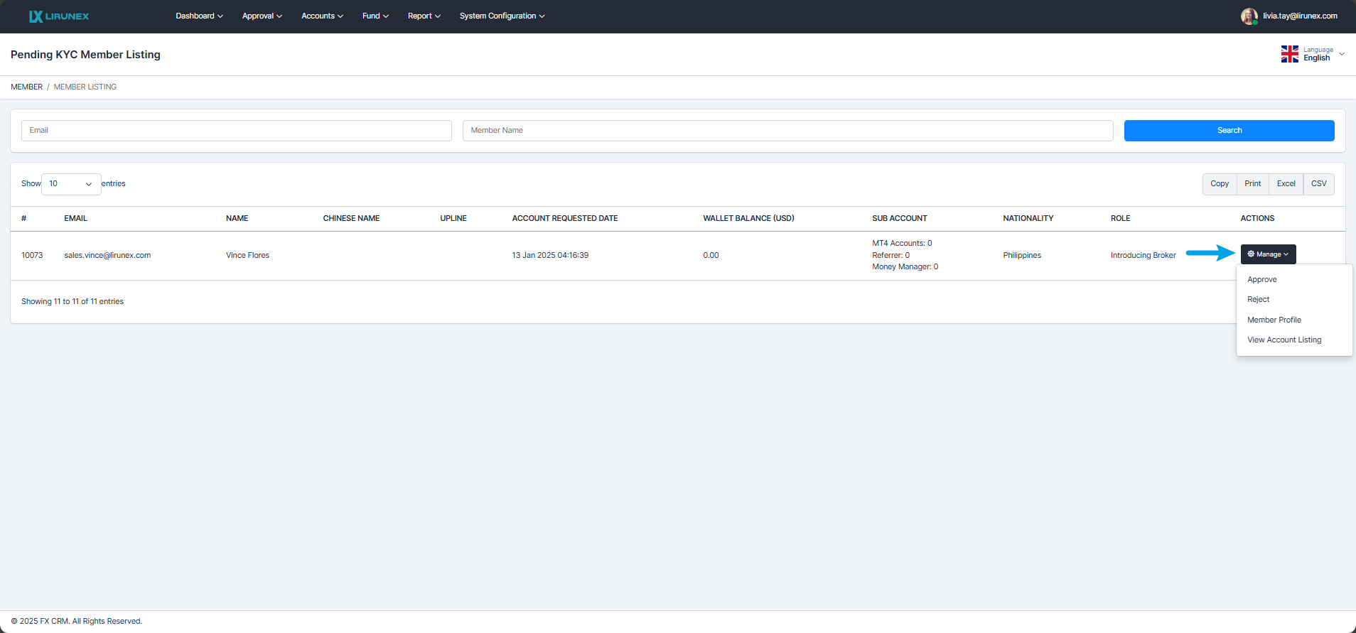 Go to Approval > Account > KYC and search for the client's Email. Kindly refer image 1.1.17.2a for detailed information.