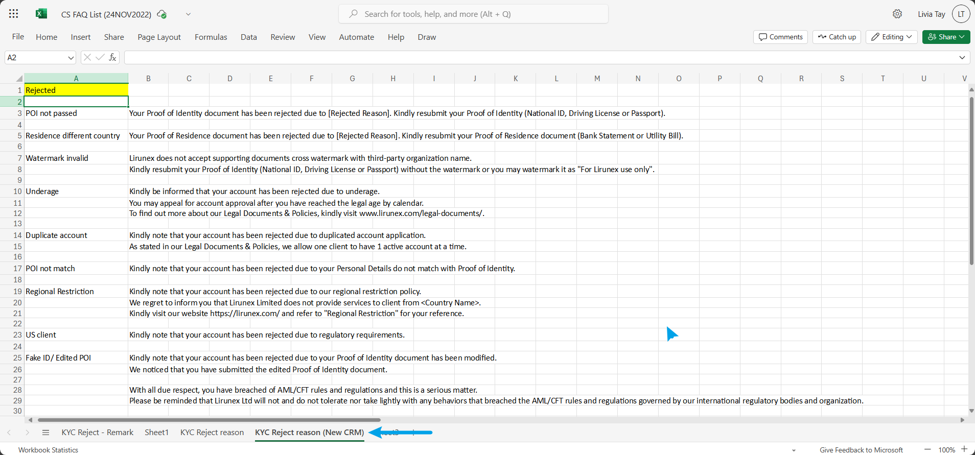 TEAMS: CS FAQ List (24NOV2022).xlsxEnsure the rejection reason is clearly stated in the email.