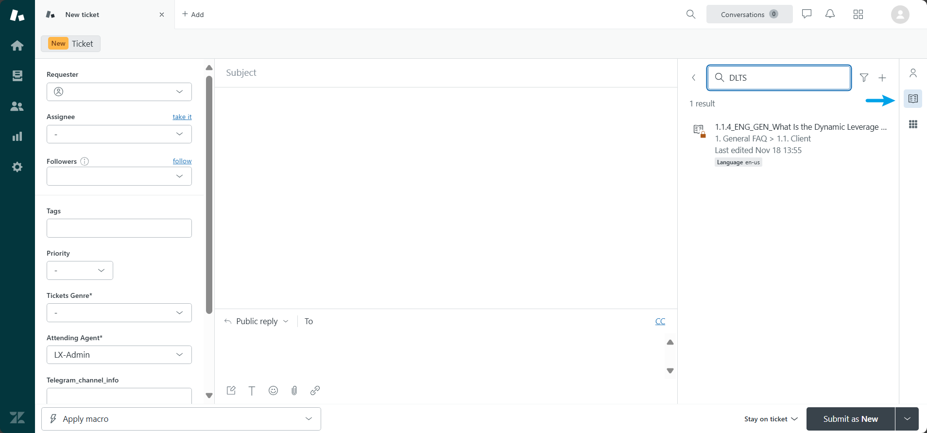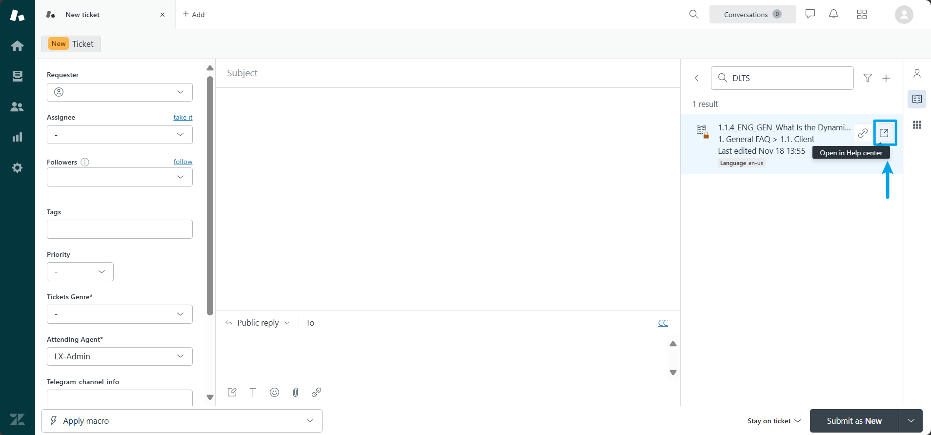 In Zendesk, open the relevant ticket or Add Ticket (just to view Articles). Kindly refer image 1.1.21.2a for detailed information.